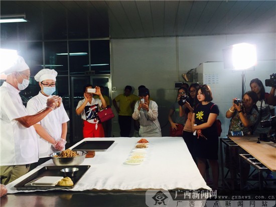 “黄记”月饼长子传承人黄庆荣为记者们展示传统月饼的制作过程。广西新闻网记者 秦丽君 摄