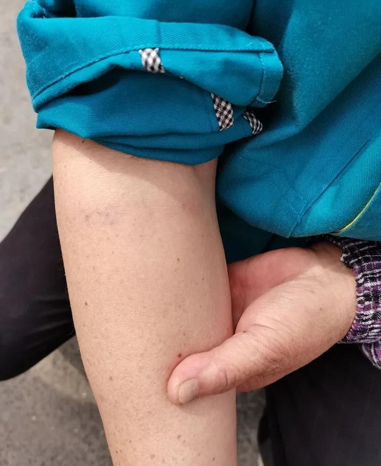 据了解,当时正在文昌府公寓室外做保洁工作的浦大姐,突然被一把从天而降的菜刀砸中了手臂,顿时感到疼痛难忍并出现了红肿。万幸的是,菜刀落下时刀柄朝下,否则后果不堪设想。