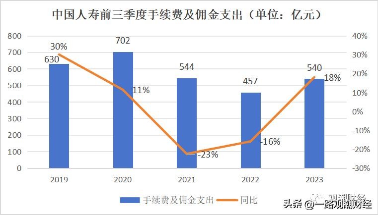 手续费及佣金支出连降两年后再次上升。据报告显示,今年前9个月,中国人寿“手续费及佣金支出”并未延续前两年因个险人力流失所致的下滑趋势,今年共花费540亿元,较去年增加约83亿元,同比上升近20%。