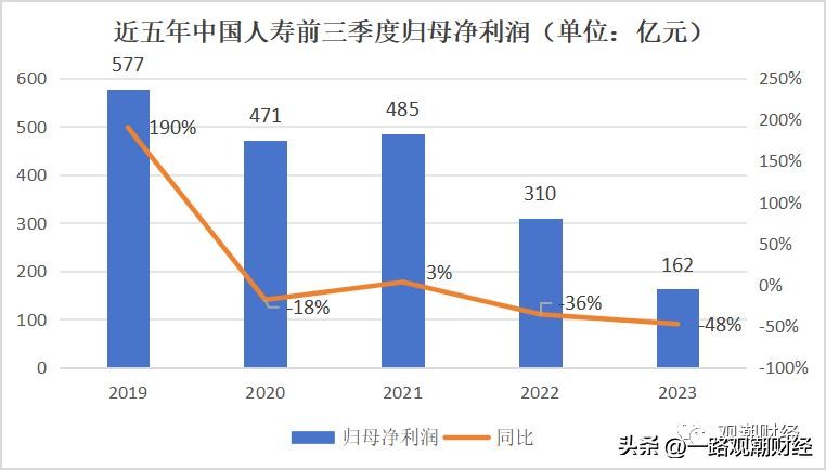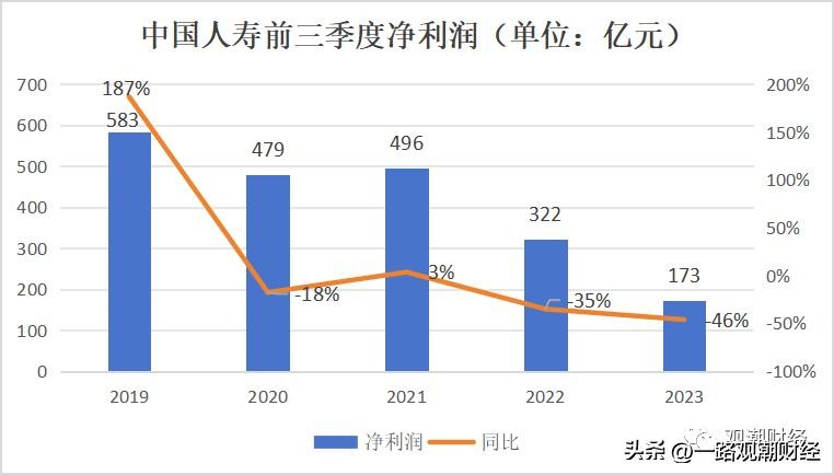 其季报显示,今年1-9月,国寿共实现净利润173亿元,较去年同期下滑46%。上图可见,2020年后,该险企净利润仅在2021年出现同比约3%的上升,其余年限依次出现同比18%、35%的下滑。
