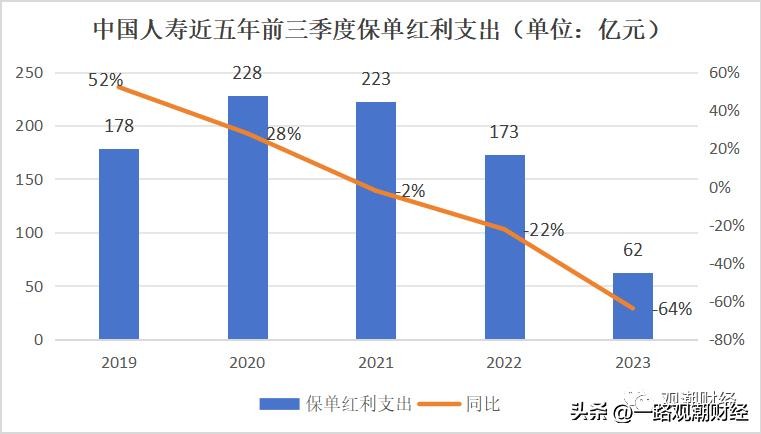 保单红利支出连年下滑,今年下滑幅度超6成。根据三季报,今年前9月,其保单红利支出约62亿元,较去年同期减少近111亿元,同比下降64%,这是最近5年中最低的一次。在几个支出项中,保单红利支出是唯一一个下滑的,而这个下滑或为受投资收益所累。
