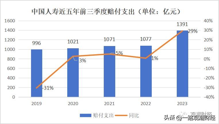 赔付支出上涨近三成。今年前三季度,中国人寿赔付支出高达1391亿元,较2022年上半年增长了约314亿元,同比上升29%。此赔付金额近乎保费收入的四分之一,增速也是五年内最高的。