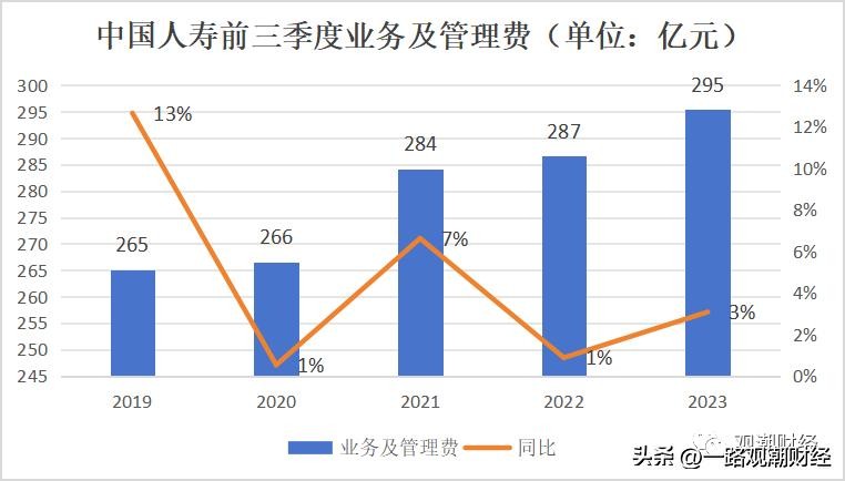 几项核心费用中,业务及管理费用涨幅最小。今年前三季度其业务及管理费用达295亿元,近300亿,较去年同期增长3%,该项支出达到近五年的最高值。