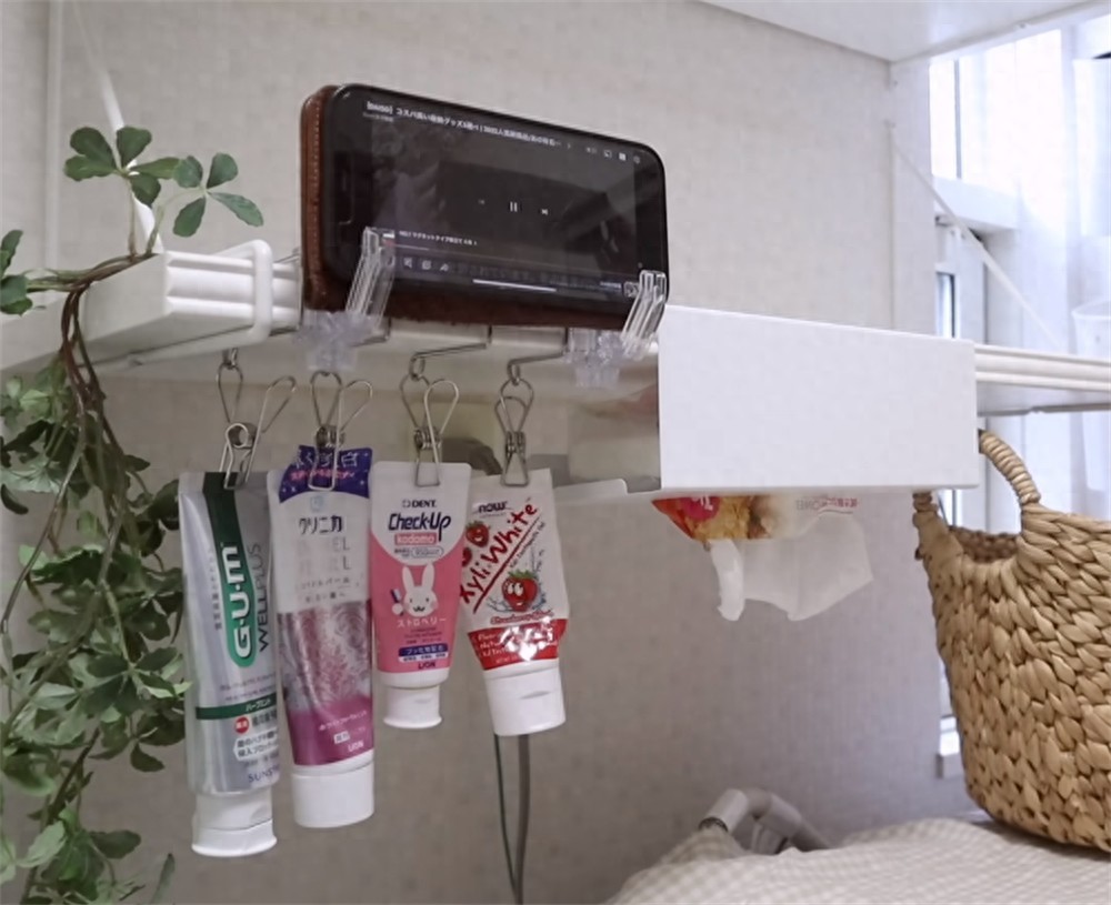 这种透明的边框挂钩,真的用途太丰富了,它可以用在家里窗台、门框、桌边等一系列突出的边框上,固定后就可以挂置各种各样的生活杂物了。