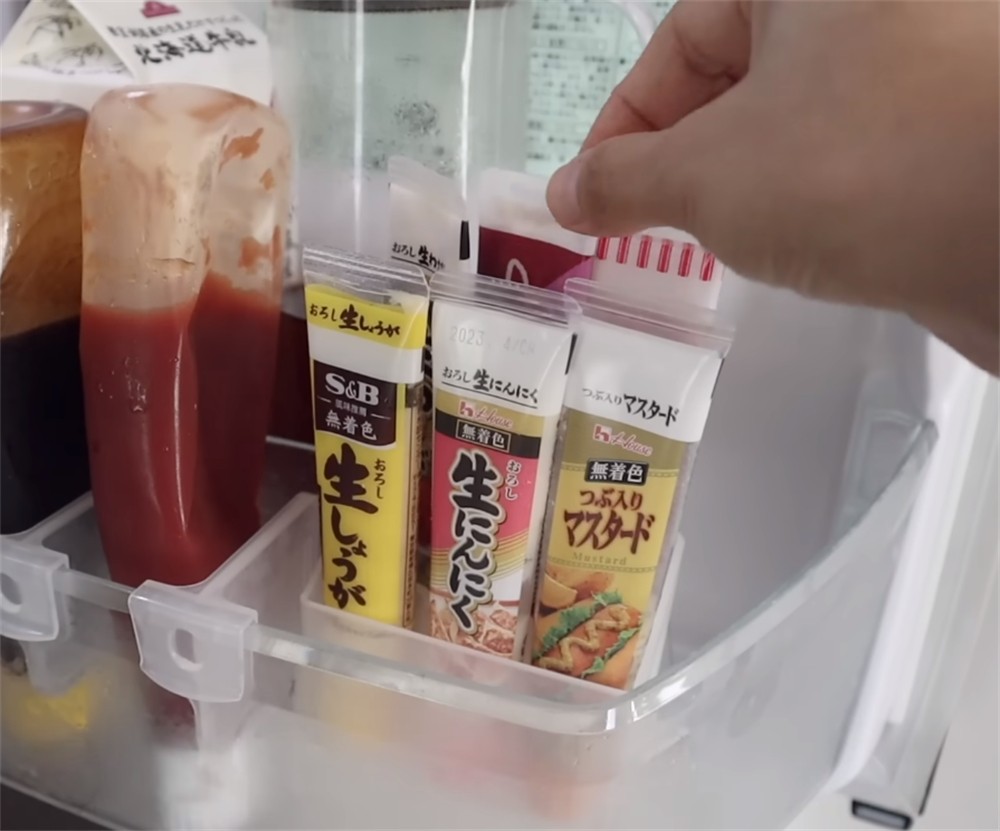 放在冰箱的话,我个人尤其建议放在冰箱门的收纳槽里,把那些东倒西歪的调味管整理起来后,看起来真的是整洁有序了不少,舒服多了~