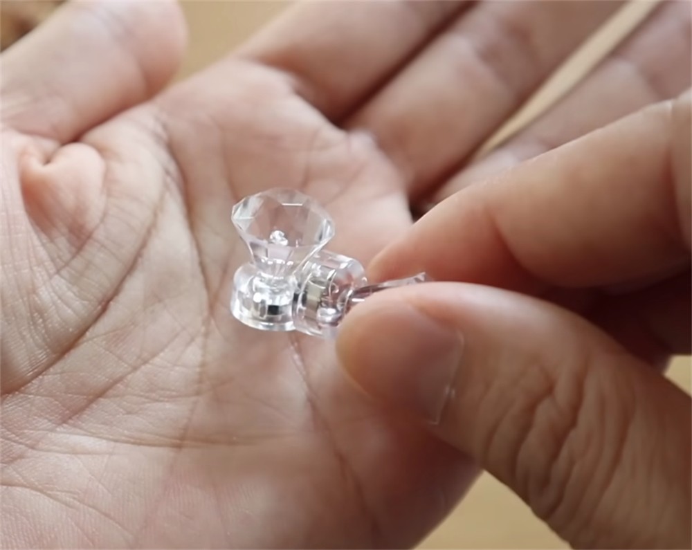 这种钻石形状的磁吸扣,也同样是颇具巧思的一个收纳小物,它钻石形状的卡头,其实像是一个挂钩,那些带挂环的家居用品,都可以轻松挂在上面。