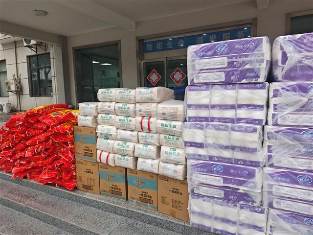 上午,大家一起将大米、面条、菜籽油、卷纸等生活物资一一搬到医院,这些物资价值6000多元。