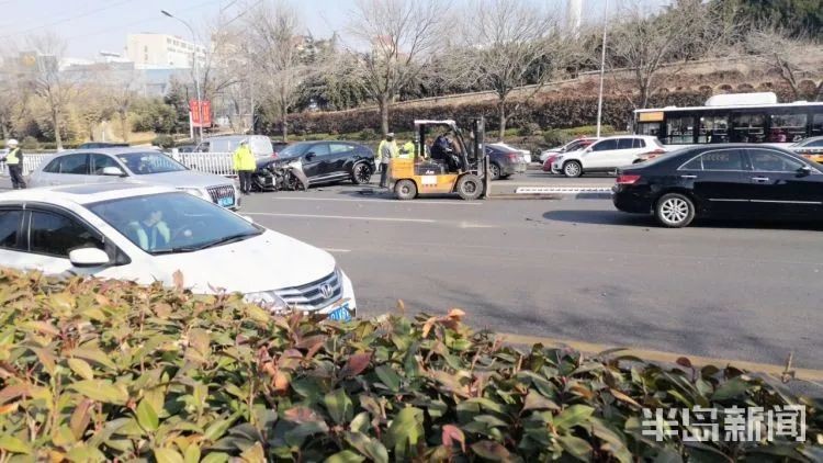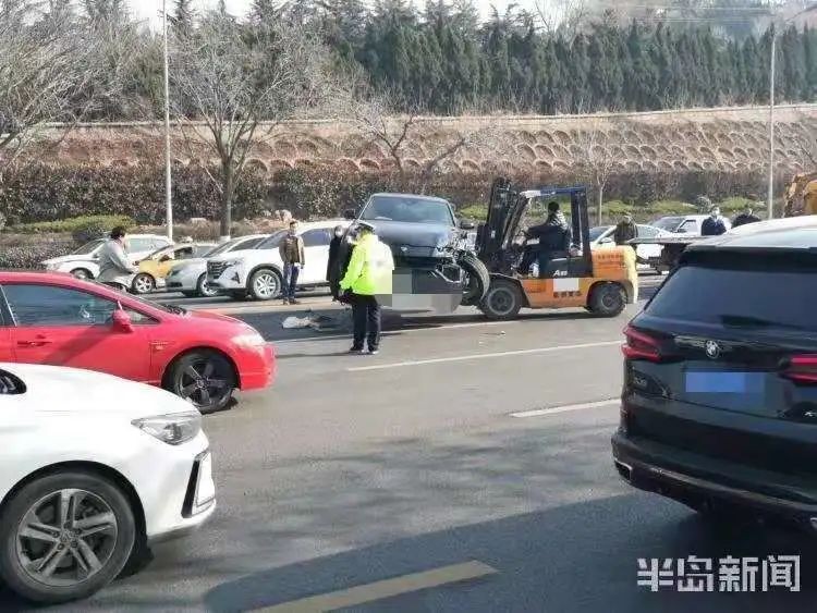 下午2点左右叉车赶到现场,将事故车辆送上拖车。