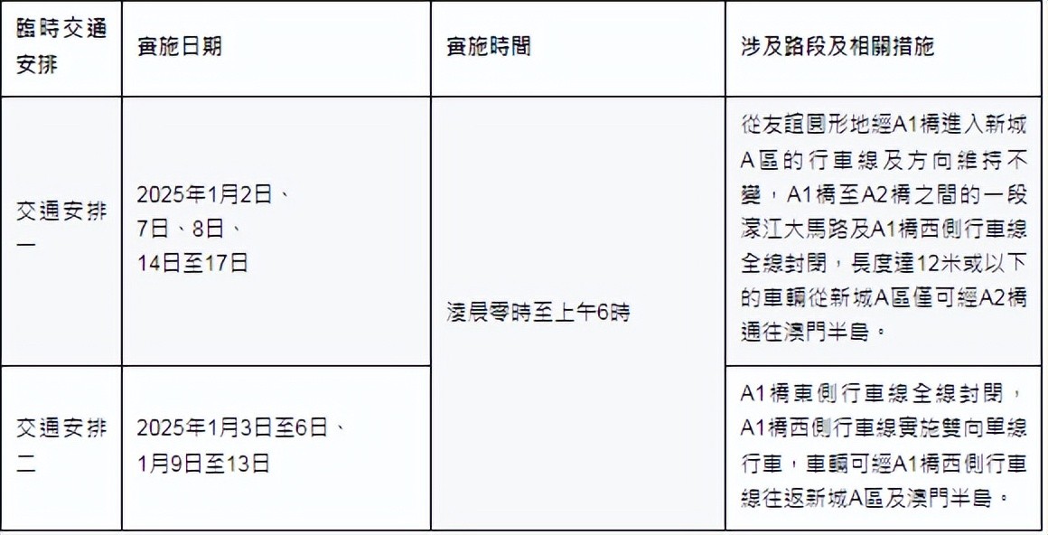 巴士服务方面,受工程影响,2025年1月2日、7日、8日及14日至17日每日凌晨零时15分至上午6时,101X路线需改道行驶,但停靠站点不变,详情可查阅澳巴网页(http://www.tcm.com.mo)。
