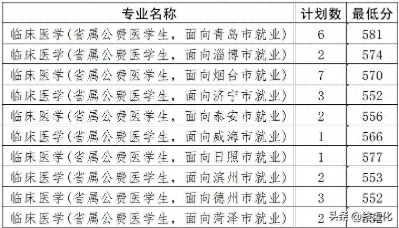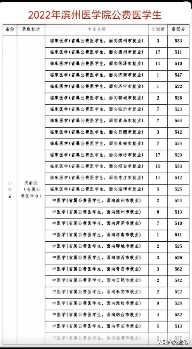 #头条创作挑战赛#2023年滨州医学院的公费医学生录取分数线是越来越高了,原来看不起的人现在已经是高攀不上了。以菏泽为例,2022年录取最低分是510,今年一下子暴涨到552,比去年的临床医学普通批次分数还高,烟台、淄博已经达到570分。而且全省计划人数也是骤减,全省只有不到30人。