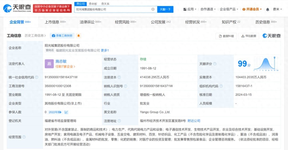 资料显示,阳光城成立于1991年8月,经营范围含对外贸易、电力生产、电子通信技术开发、房地产开发、对医疗业的投资及管理等。该公司大股东为福建阳光集团有限公司,持股15.76%。