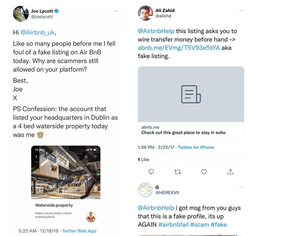 爱彼迎另一个最常见的问题是欺诈,有22.3%的消费者投诉爱彼迎平台的虚假房源列表。弗格森本人就曾经历过,由于平台的原因,导致2017年时,他们全家人曾在巴黎的街头无处可去。“这一经历让我关注到了爱彼迎平台上存在的许多缺陷和漏洞。用户在使用爱彼迎时,需要详细了解平台的运作方式和存在的风险,这很重要。”