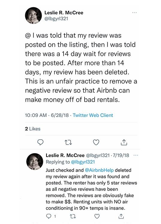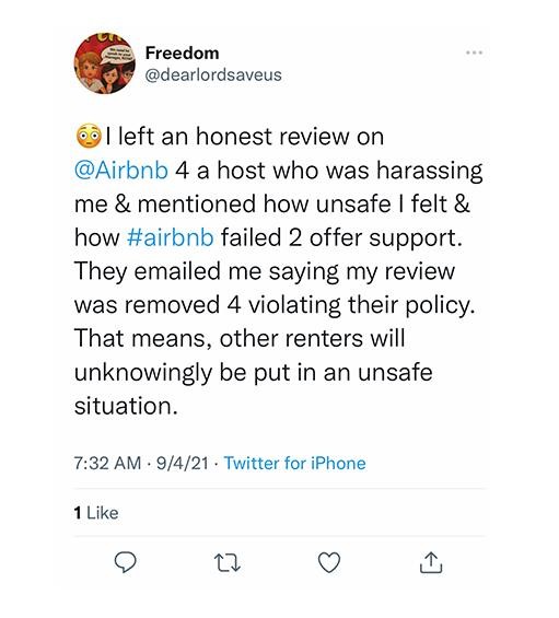 除此之外,报告还提出了爱彼迎平台的留言审查问题。由于平台有着非常“严格”的审查规则,这也就意味着部分住客的批评性评论可能永远不会显示,这令新住客无法客观地评价这处房源的好坏。一位女性网友曾发推文表示,她在爱彼迎租住的公寓门口受到了人身安全威胁,事后,她评价称这处房源位于一条危险系数较高的街区。随后,她的评论被平台用“与实际情况不符”的理由删除。