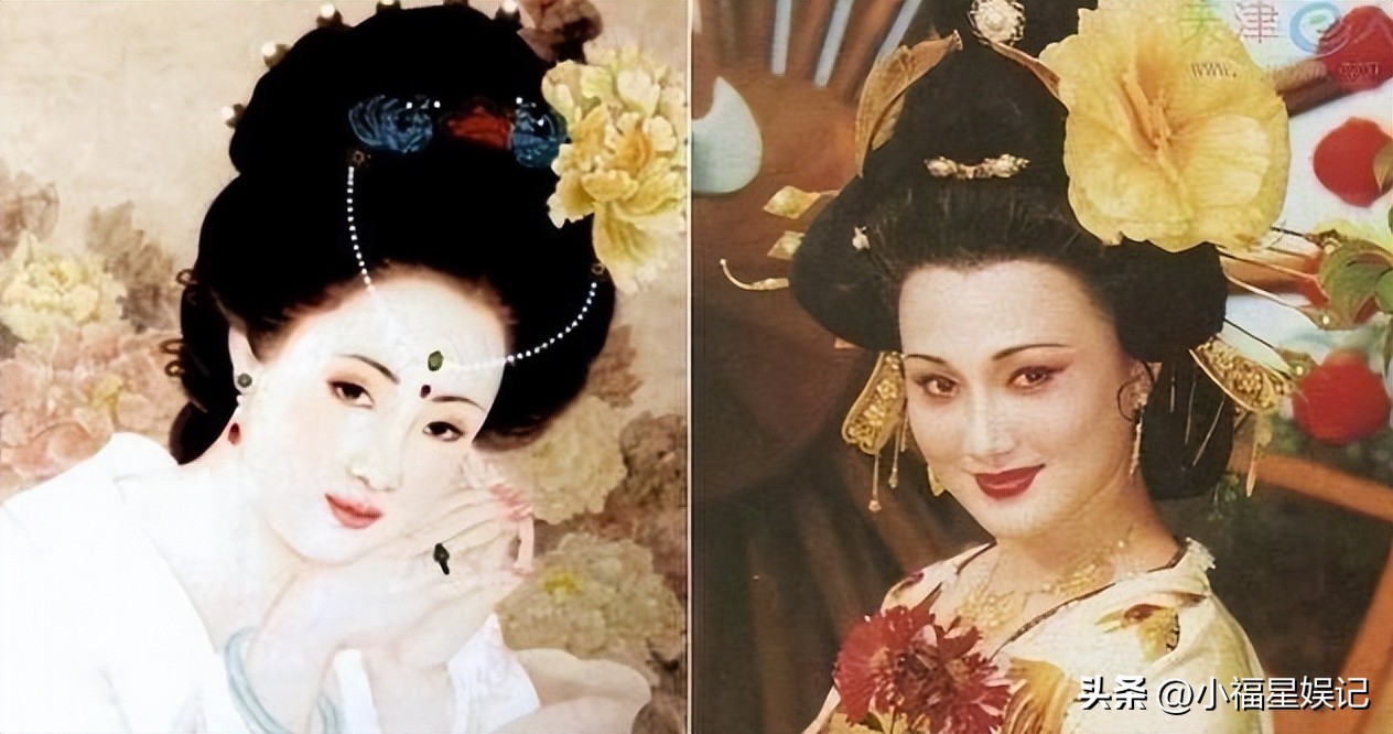 造型就像是从古画中走来的杨贵妃般,不论是牡丹金步摇还是花团锦簇的衣服,相似度都让人震撼。
