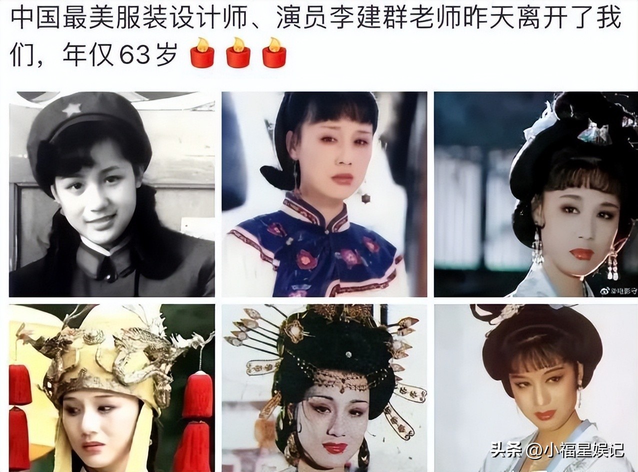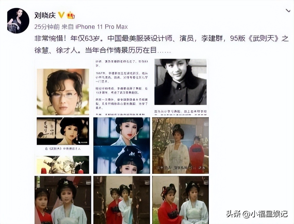 不常发文的刘晓庆,也在个人社交平台发文沉痛悼念,她写道:非常惋惜!中国最美服装设计师、演员,李建群,当年的合作场景历历在目。