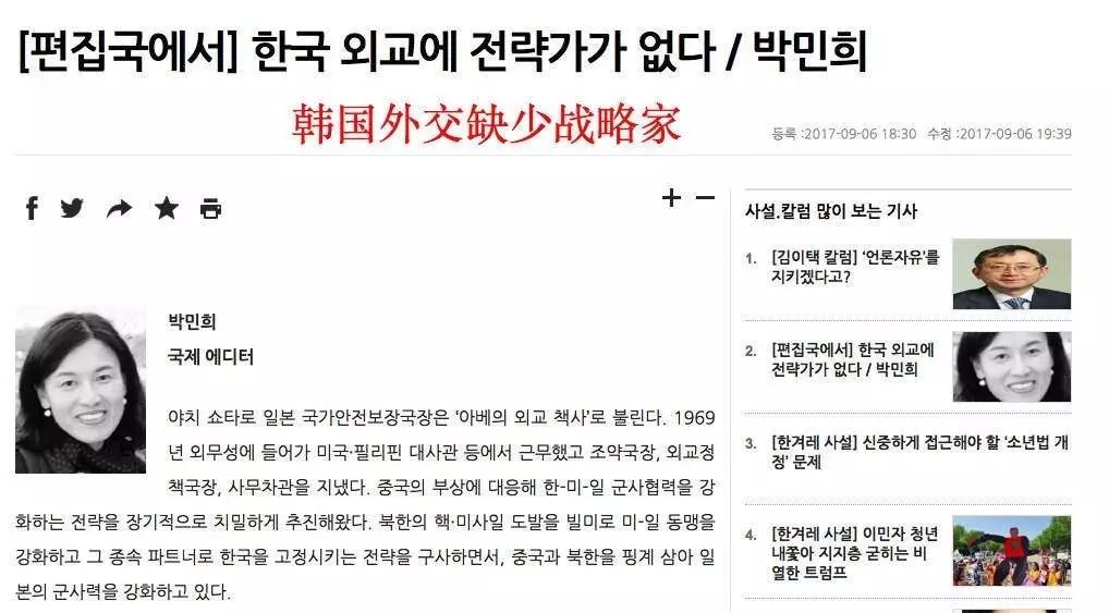“令人悲观的是,由于韩国在部署萨德问题上充分暴露出了弱点,美国特朗普总统俨然已经将韩国视为最好对付的国家,不断拿出各种借口要求韩国支付巨额资金。由于国内政治深陷危机而不得不设法凝聚极右翼支持势力的特朗普总统正以‘废除自贸协定’为筹码露骨施压韩国对自贸协定作出更加有利于美国的改动。在取消导弹弹头重量限制的问题上,虽然他看似表现得颇为仁慈,实际却是韩国以‘采购数十亿美元美产武器装备’为代价换来的结果。”