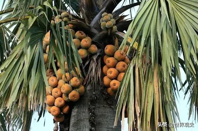 7、海椰子(Lodoicea maldivica)是棕榈科、巨子棕属植物。常绿乔木。树干挺直,高15-30米,单项树冠,整齐。叶羽状全裂,长4-6米,裂片多数,革质,线状披针形。雄花聚生于分枝上部,雌花散生于下部;雌花基部有小苞片数枚,萼片革质,圆形,宽约2.5厘米,花瓣与萼片相似,但较小。坚果倒卵形或近球形,顶端微具三棱,长15-25厘米,内果皮骨质,种子1粒;胚乳内有一富含液汁的空腔。海椰子的果实横宽35-50厘米。海椰子外面长有一层海绵状的纤维质外壳,剥开外壳后就是坚果。海椰子的一个果实重可达25千克,其中的坚果也有15千克,是世界上最大的坚果,被称为“最重量级椰”。