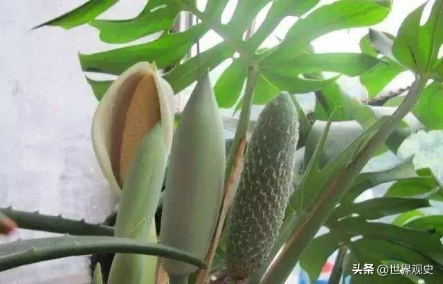 9、龟背竹(Monstera deliciosa Liebm.)是天南星科龟背竹植物,攀缘藤状灌木。茎粗壮,呈绿色,有苍白色半月形叶迹,有肉质气生根;叶成2列,柄长,叶呈心状卵形,厚革质,边缘羽状分裂;花序柄粗糙,佛焰苞厚革质,肉穗花序近圆柱形,花单性,淡黄色,花期8—9月;浆果淡黄色,果实可食用。