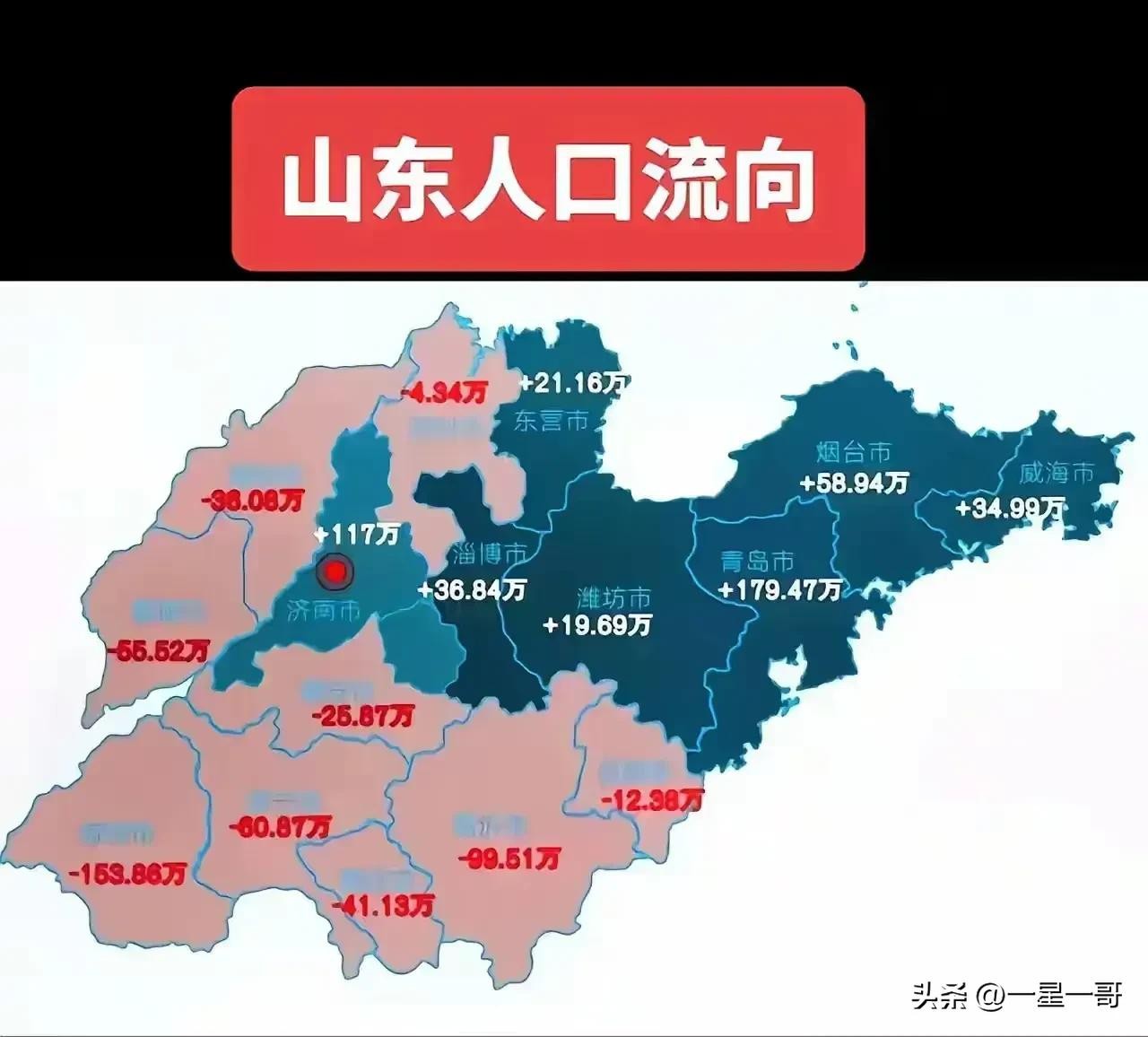 省内鲁西南地区(如菏泽、临沂)人口流出严重,主要流向胶东半岛(如青岛、烟台、威海、潍坊)或省外发达地区。