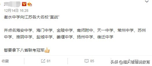 联考还没开始,12月时网上就流传了衡水中学向江苏各大名校宣战,誓要拿下八省联考冠军的消息: