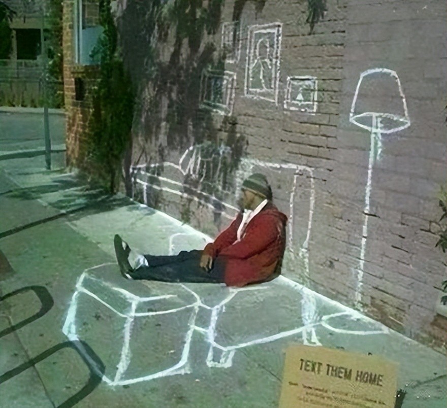 第二个:这是流浪汉的“家”,他正悠闲的坐在“沙发上”,条件允许的话谁又不想有一个属于自己的家呢?