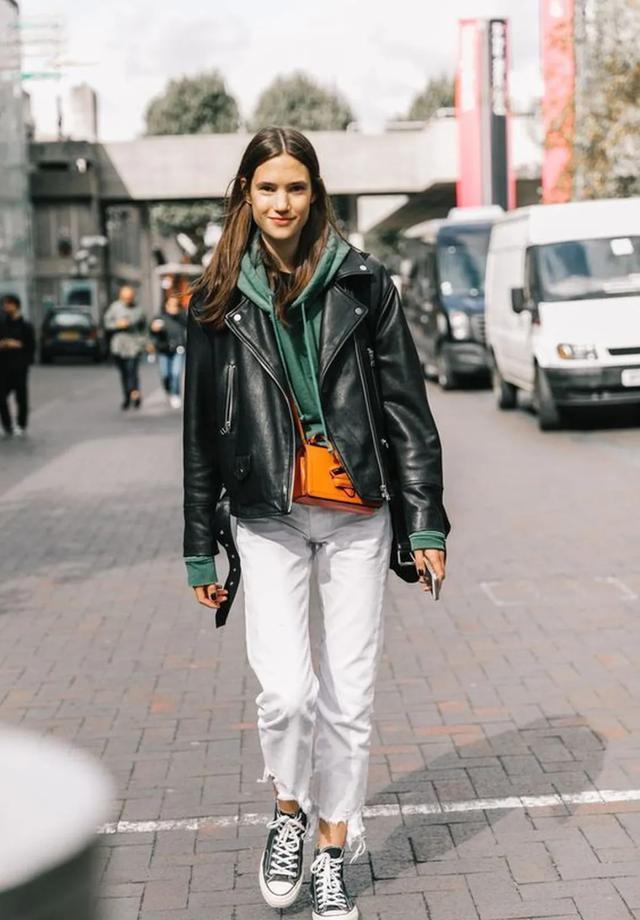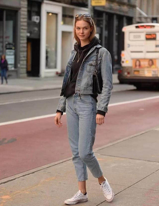 减龄组合的必备单品,帆布鞋、牛仔裤、宽松卫衣,随便一穿都像是大学校园的青春少女。不过想增添时尚感还是需要一点小心机,卫衣可以选择纯色的,裤子的颜色也尽量与卫衣相配,外套也不需要太花哨,全身look的造型颜色不易过多。