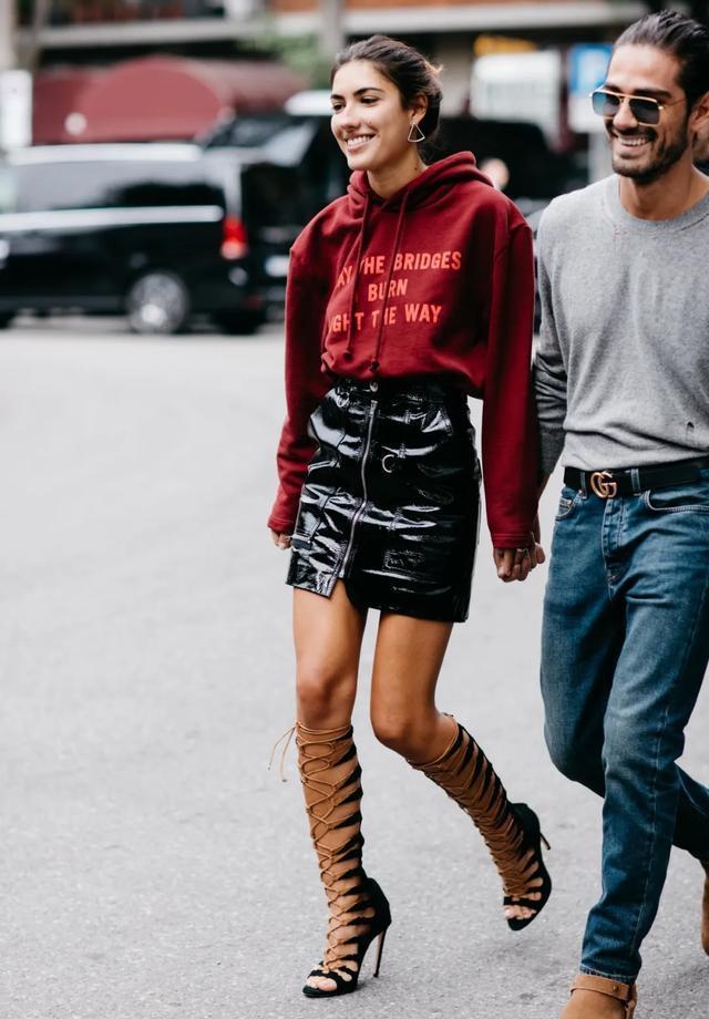 想要变得又酷又A但是又不想显得攻击性太强,可以试试卫衣搭配皮裙的组合。半身皮裙看起来就是个酷姐,配上卫衣又有几分亲和力,又甜又酷谁能不爱呢?皮裙建议短款和紧身最好,可以修饰身材,勾勒出下半身曲线,还有点小性感呢。