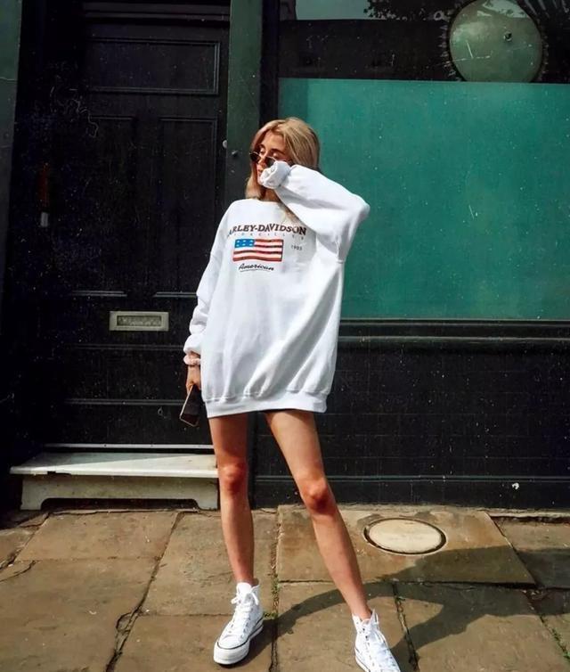 Oversized卫衣是玩转下衣失踪的最好选择,轻轻松松就能在遮挡上半身的小肚子及拜拜肉,露出自己的大长腿。下半身短裤最好不要是宽松版型,否则会使整个造型看起来过于随意,鞋子可以选择高帮款式,呈现轻松休闲的感觉。2、 卫衣+裙子卫衣搭配裙子的组合真的是对任何身材的妹子都很友好啦,而且这套组合给人的气质就是当今很流行的说法,可盐可甜,可A可奶。现今最强减龄组合,小编认为绝对可以属于春日穿搭里的王炸牌!
