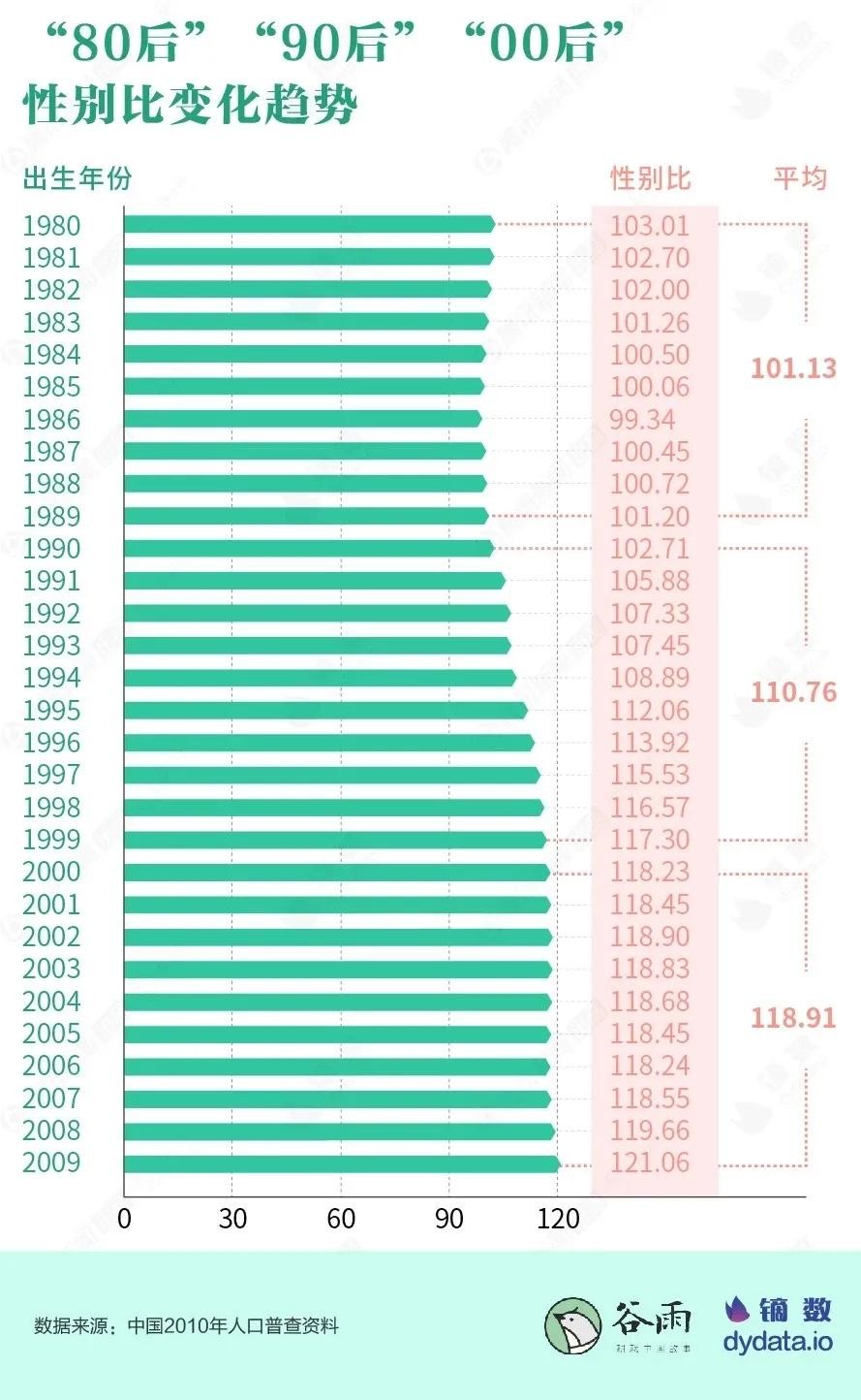 根据2010年第六次全国人口普查数据,以及“谷雨数据”整理资料,我国90后男女性别比(以女性等于100计算,下同)均值为110.76,高于联合国划定的107警戒线。同时远高于80后101.13的性别比,但远低于00后118.91的性别比。