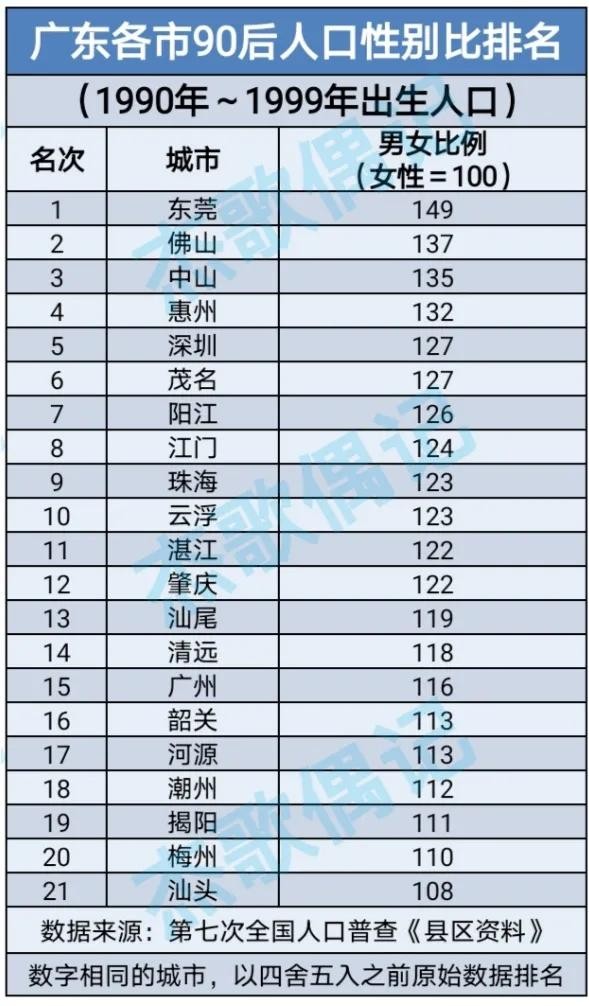 根据2020年第七次全国人口普查数据,广东全省21市的常住人口90后性别比,全部超过了107的警戒线。