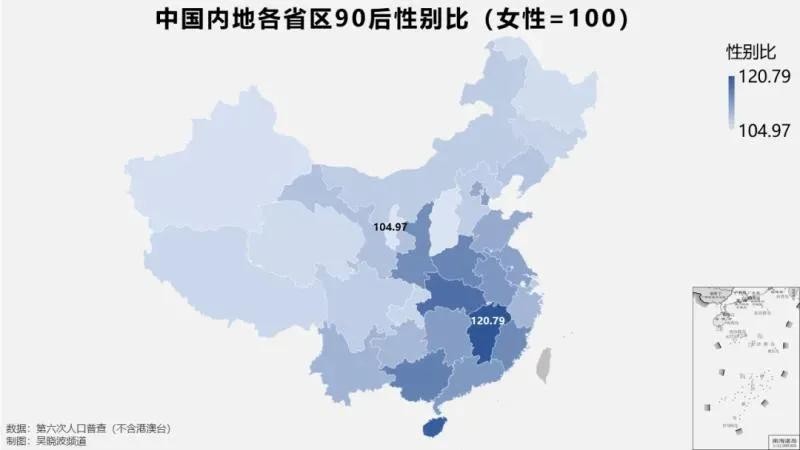 根据六普数据,我国各省市的90后性别比介于120.79~104.97区间,其中最高的是受高彩礼问题影响到结婚和生育的江西省,该省性别比为120.79,处于男女比例严重失衡的状况,江西男性结婚难、光棍多的问题已受各界关注。另外90后性别比较高的还有海南、广西、湖北等省。