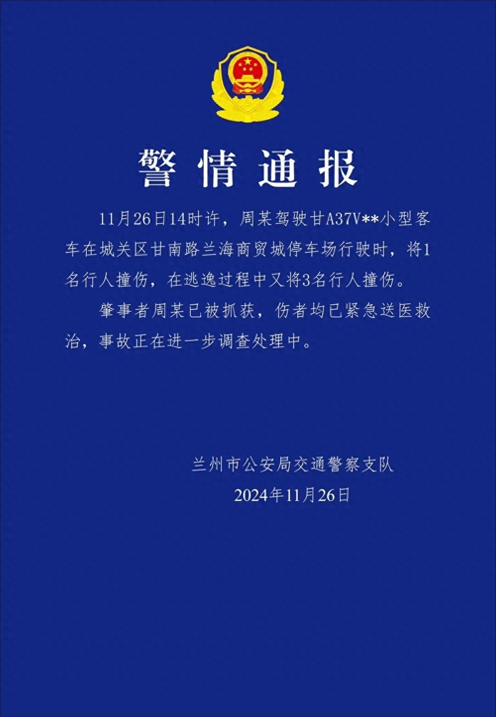刚刚,兰州市公安局交通警察支队发布通报:11月26日14时许,周某驾驶甘A37V**小型客车在城关区甘南路兰海商贸城停车场行驶时,将1名行人撞伤,在逃逸过程中又将3名行人撞伤。