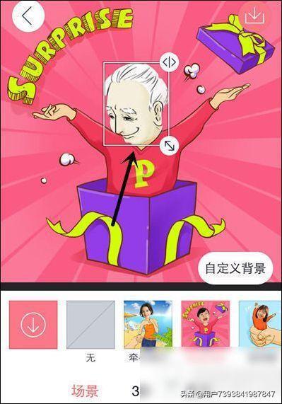 3、将画笔在照片需要抠图的位置填满,进行下一步,然后将选中的照片自定义背景场景,把头像左右移动到合适的位置如图所示,点击右上角保存按钮将图片保存。