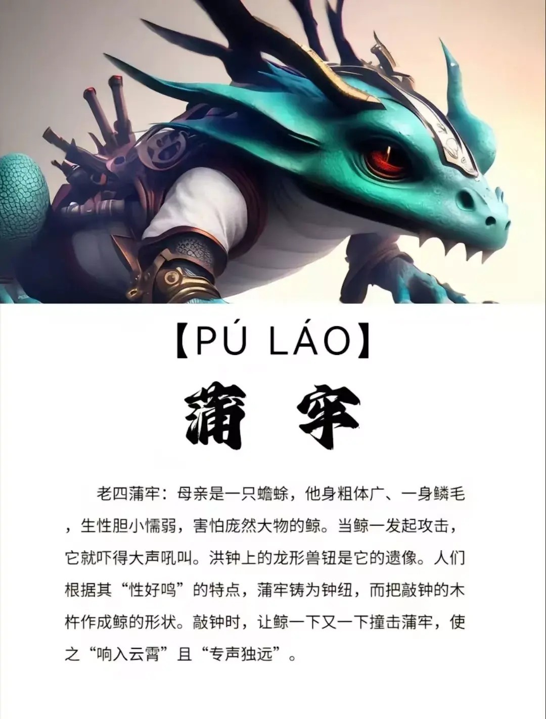蒲牢的形象象征着权威和威严。他的存在提醒人们要尊重权威和规则,保持庄重和威严的形象。