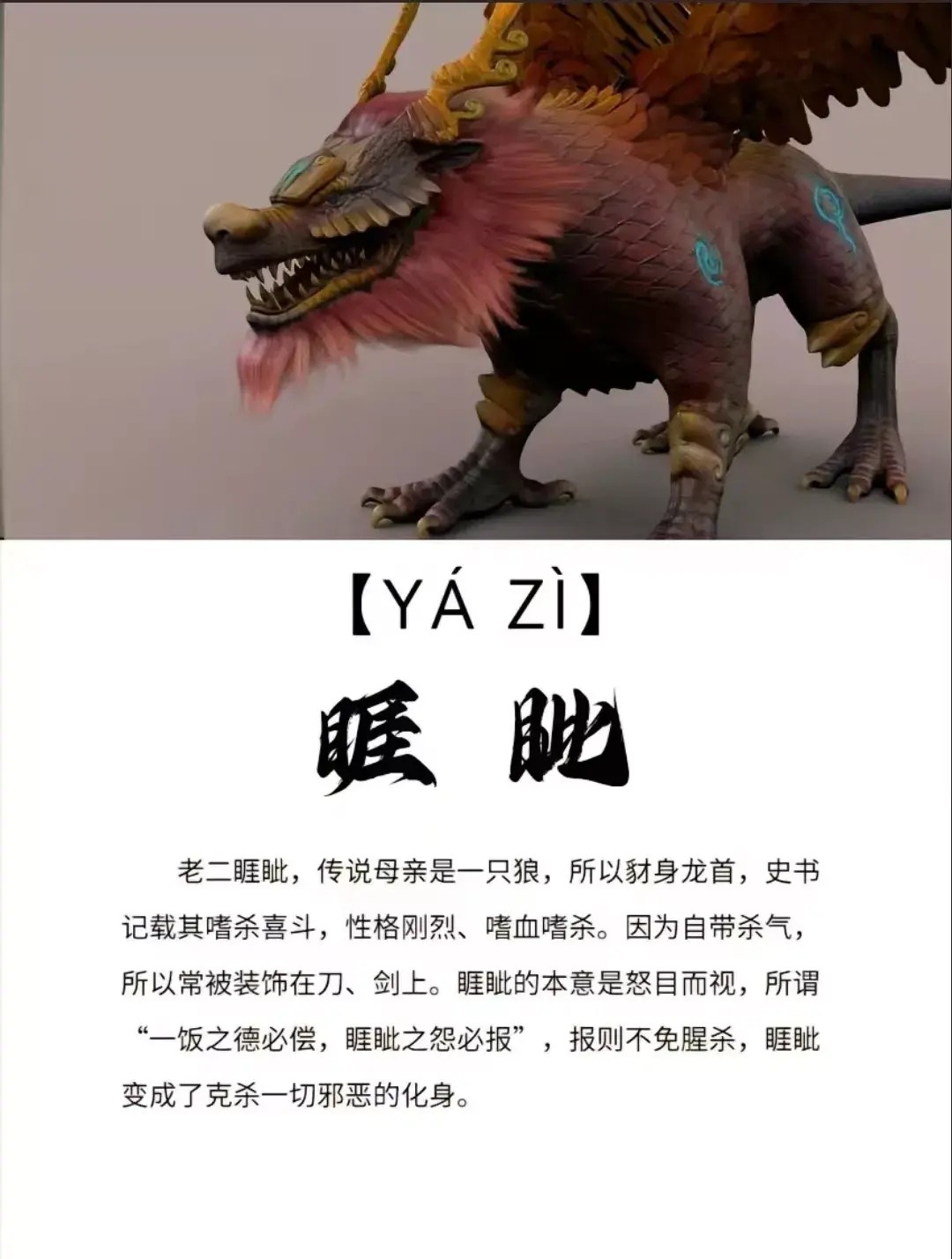 睚眦是龙的第二个儿子,他喜欢斗争和杀戮。常常出现在刀环、剑柄上的遗像上,形象威武凶猛。
