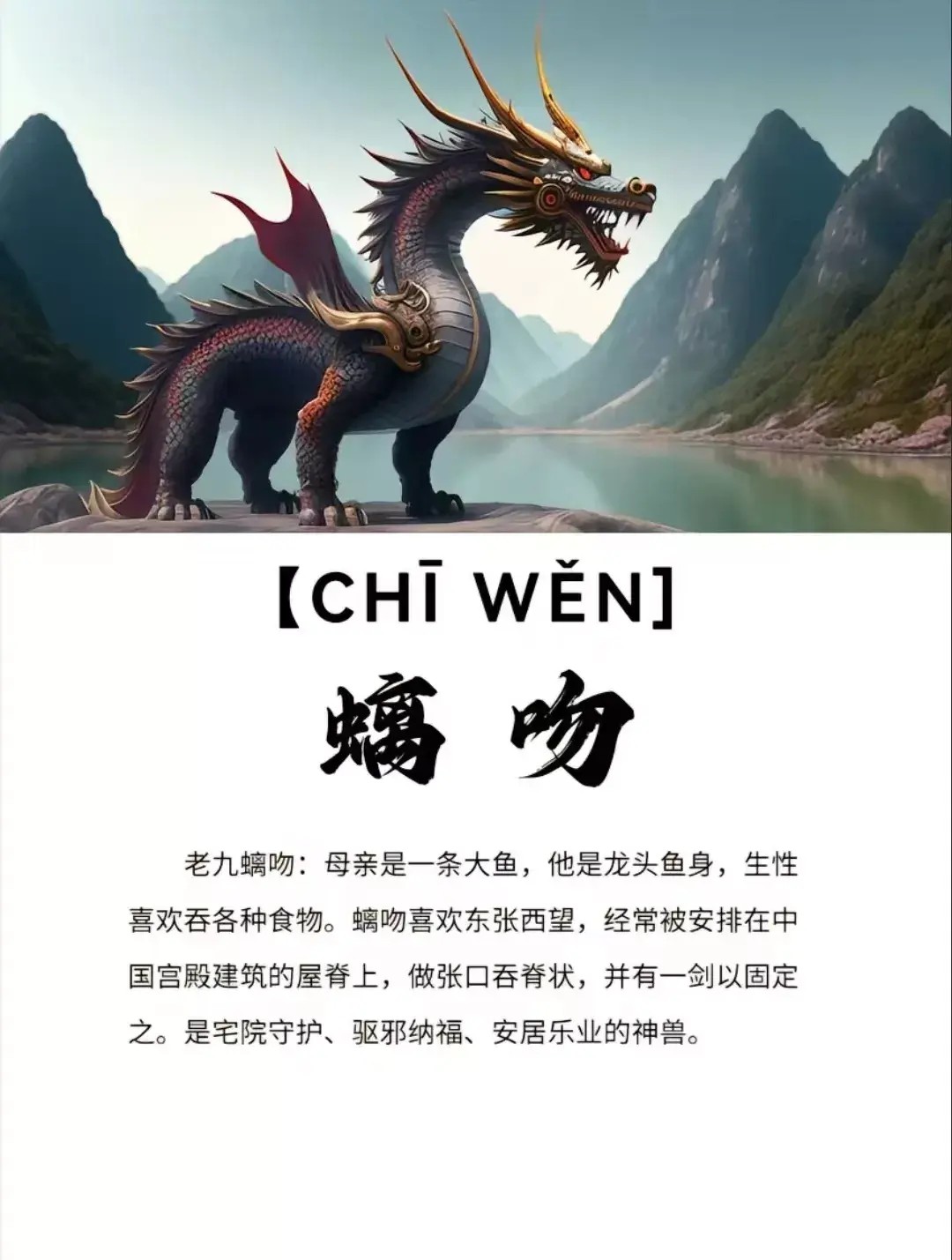 螭吻是龙的第九个儿子,喜欢吞咽。常常出现在屋顶或屋脊上,形象雄壮威严。