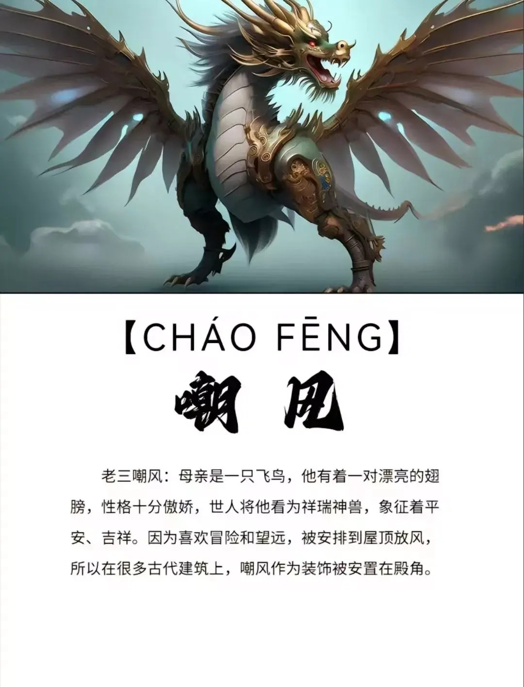 嘲风是龙的第三个儿子,他形似兽,喜欢冒险和眺望。常常出现在殿台角上,目光远大。