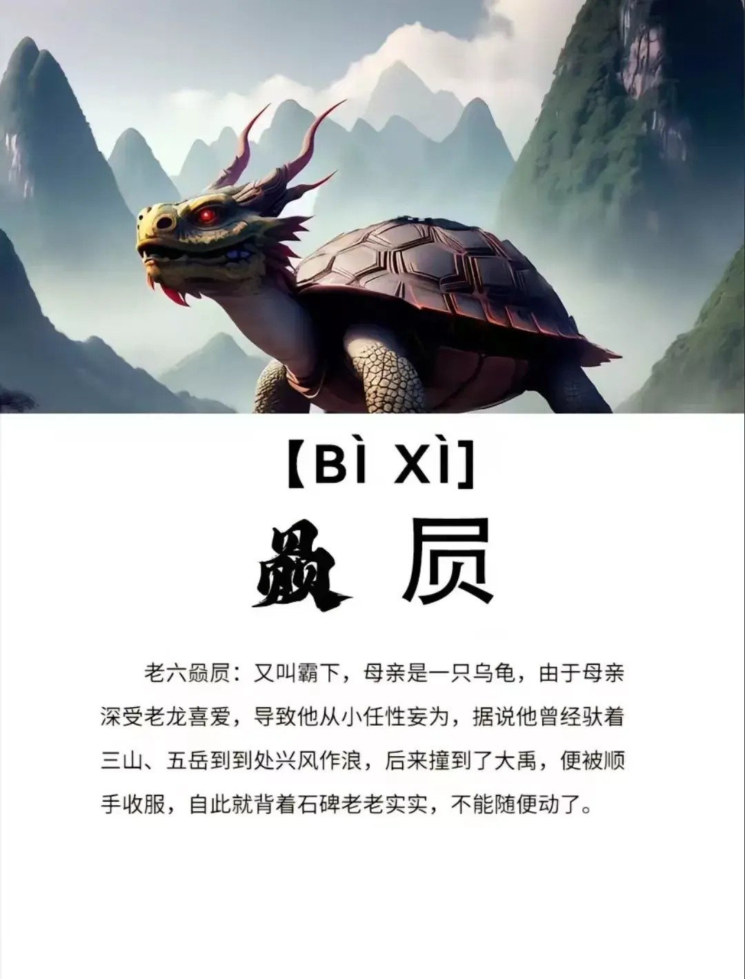霸下,又名赑屃,是龙的第六个儿子。他力大无穷,常常在江河湖海里兴风作浪,形象威猛奔放。