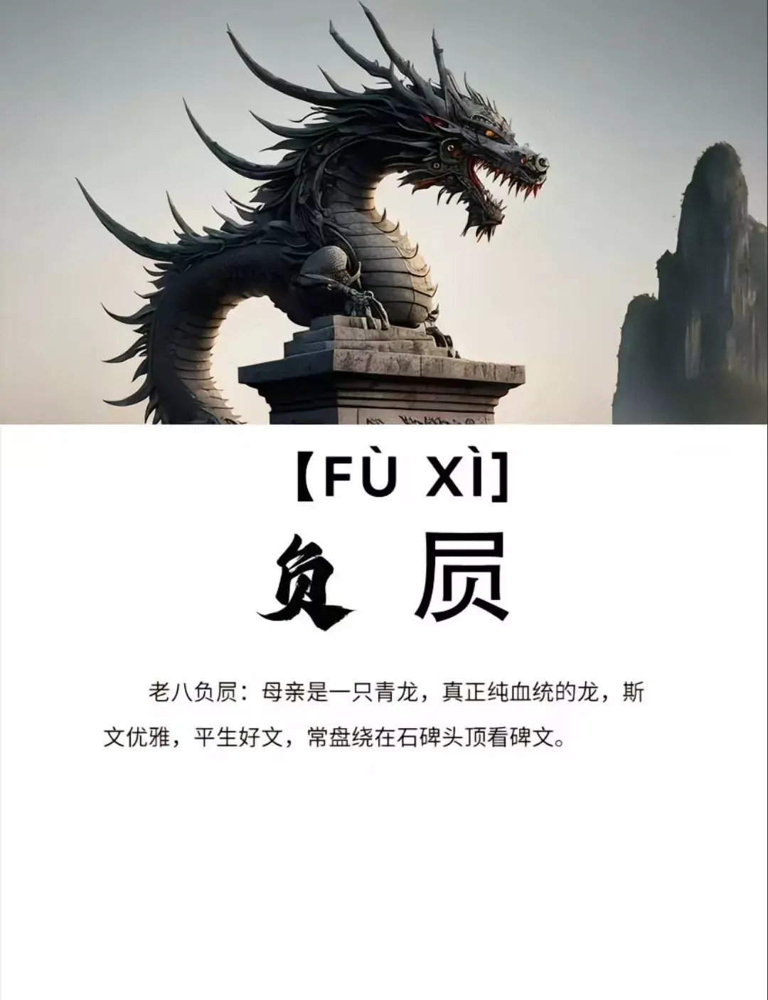 负屃是龙的第八个儿子,喜欢书法。常常盘绕在石碑顶部,形象书法之美。