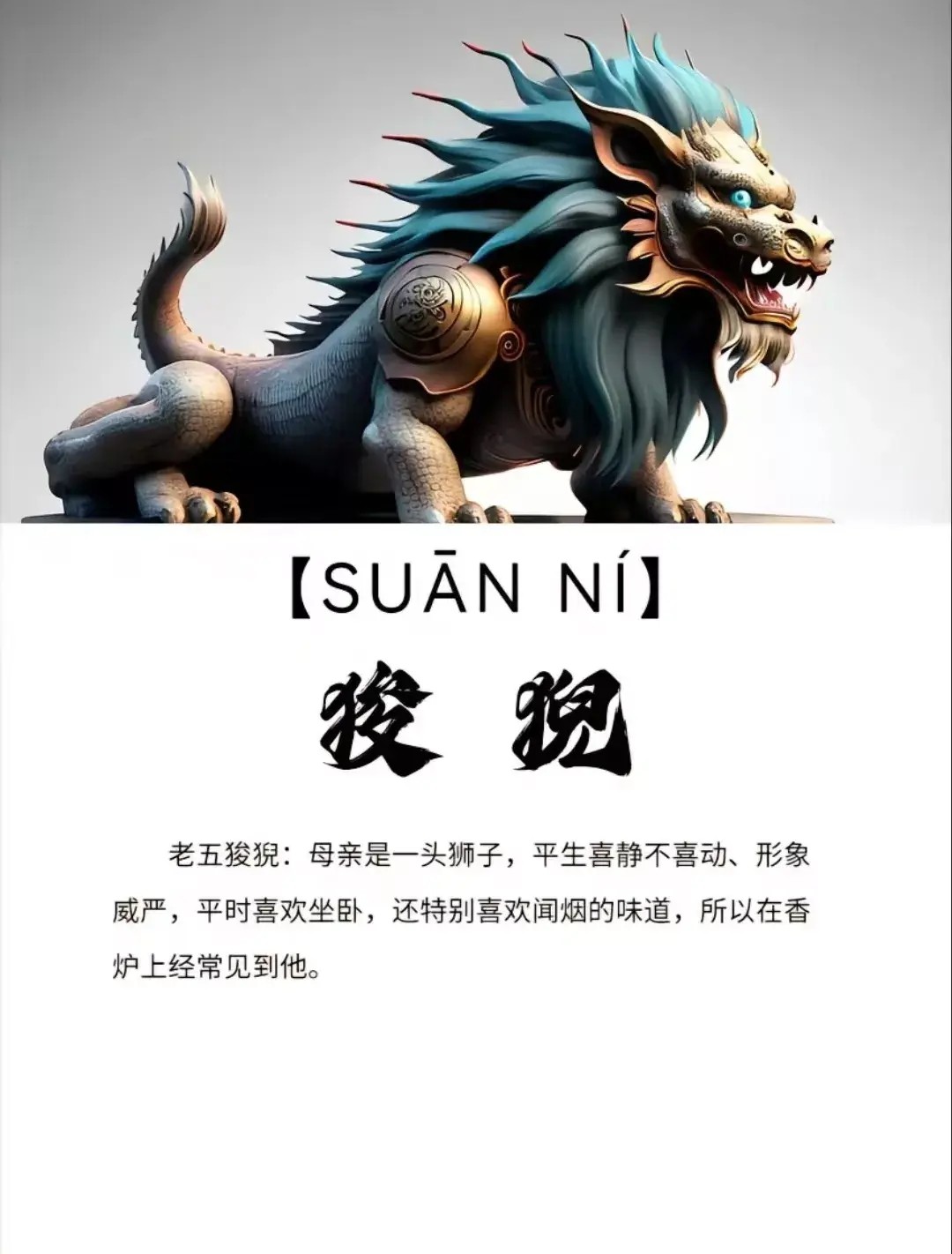 狻猊是龙的第五个儿子,他喜欢静坐,又喜欢烟火。常常出现在佛座上和香炉上的脚部装饰上。形象祥和宁静。