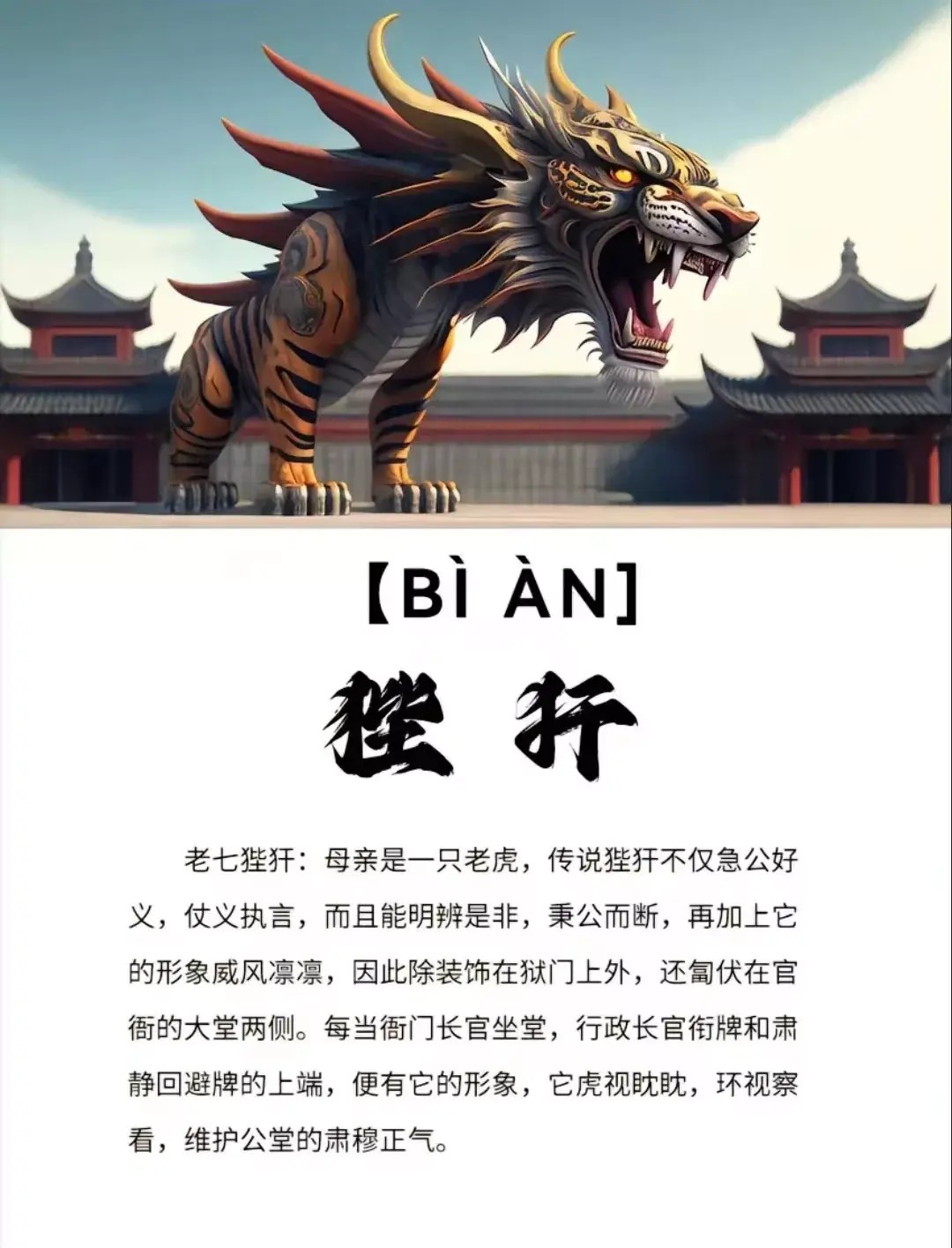 狴犴是龙的第七个儿子,形状像老虎,喜欢诉讼。常常出现在官衙和牢狱的大门口,形象威严威猛。