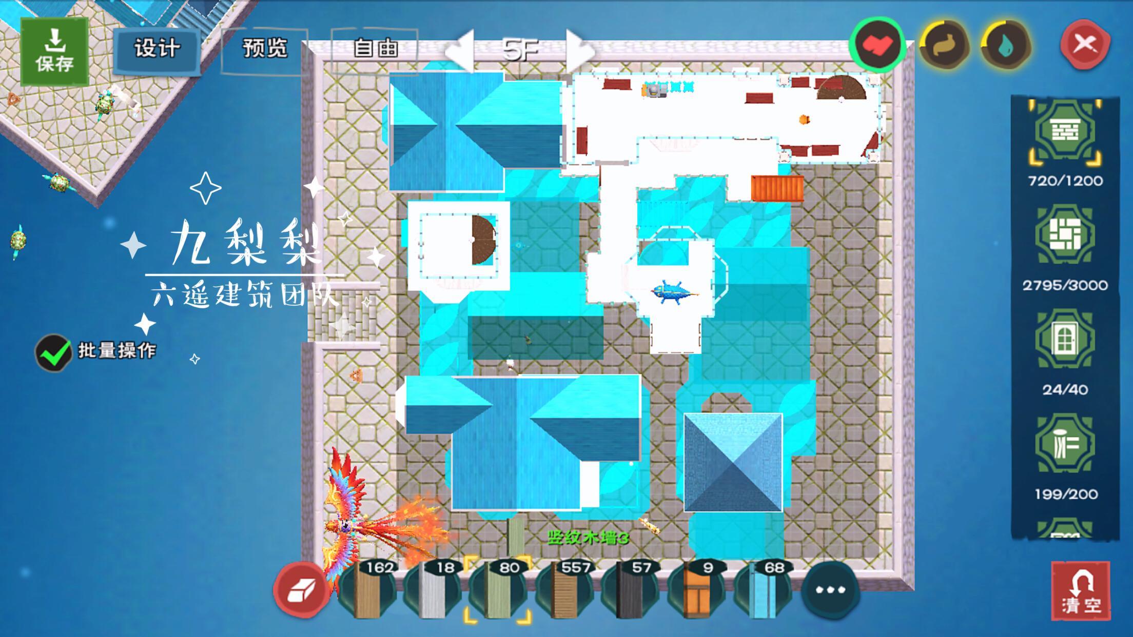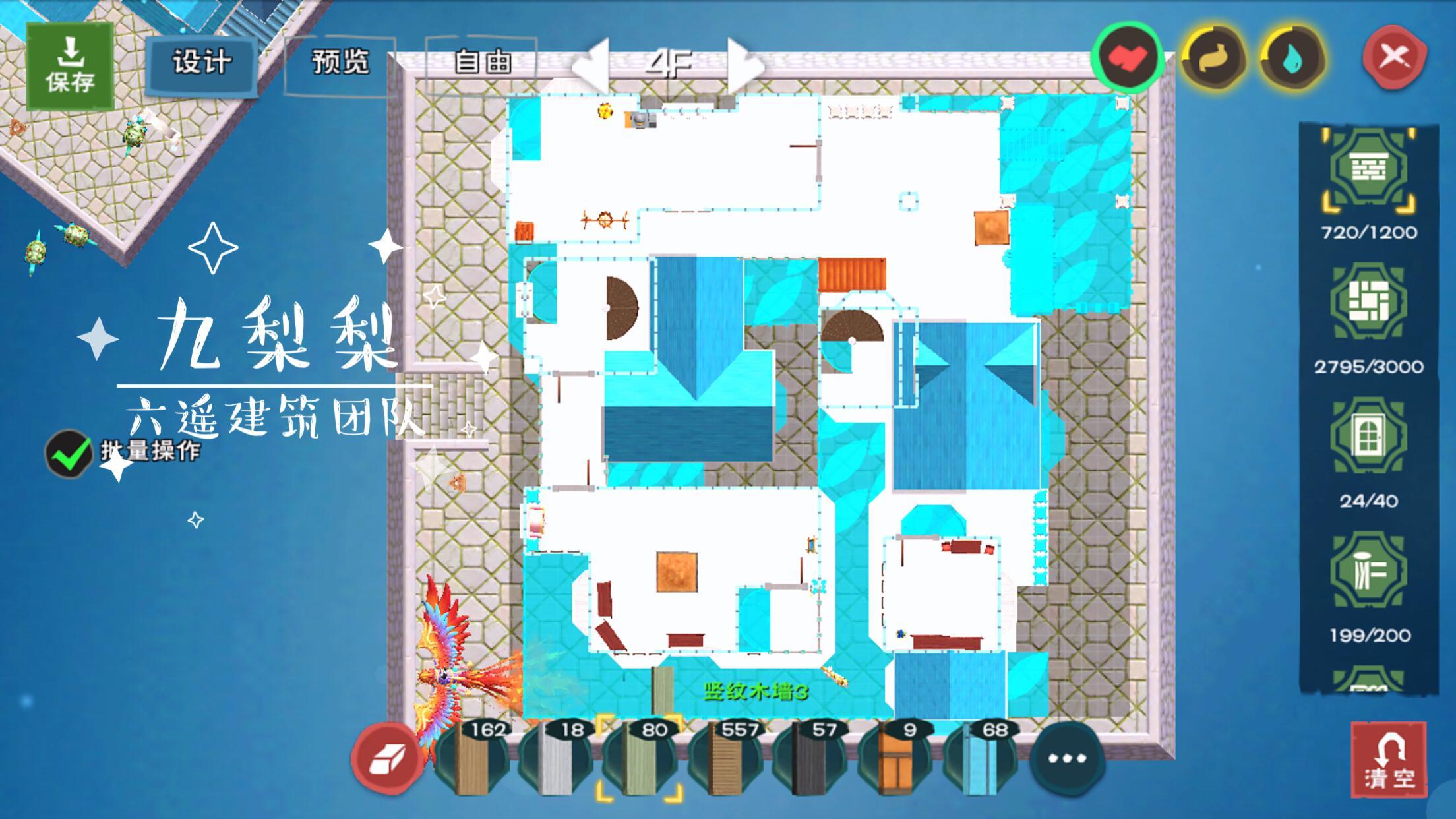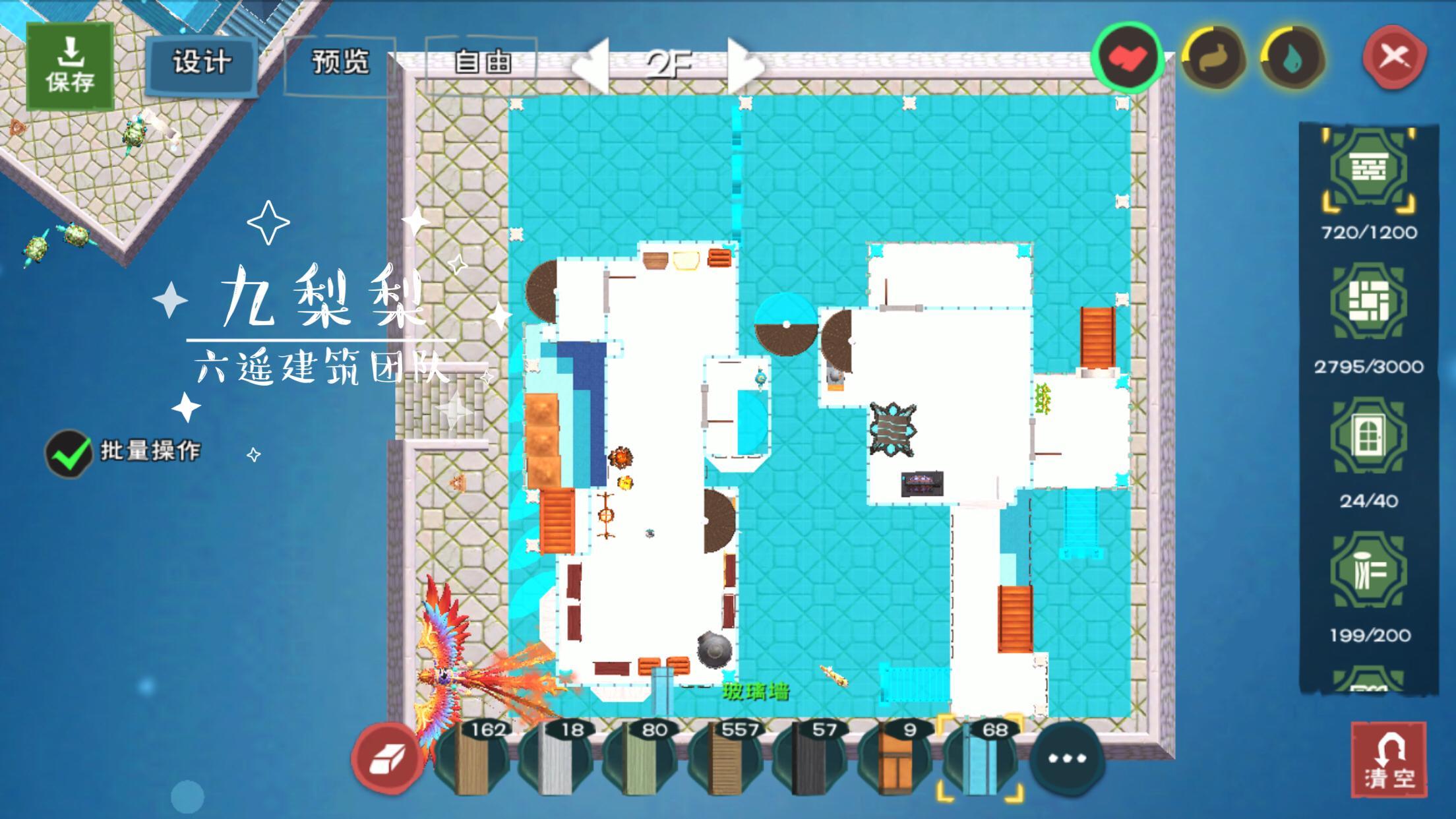 家园面积还是38x38,层数7层,修改的时候正值官方更新欧式建材和家具,所以用了一部分来搭配蓝色玻璃墙,原来一楼的地板没有修改,继续使用,二楼以上的地板改成了纯白色以提升整体亮度。