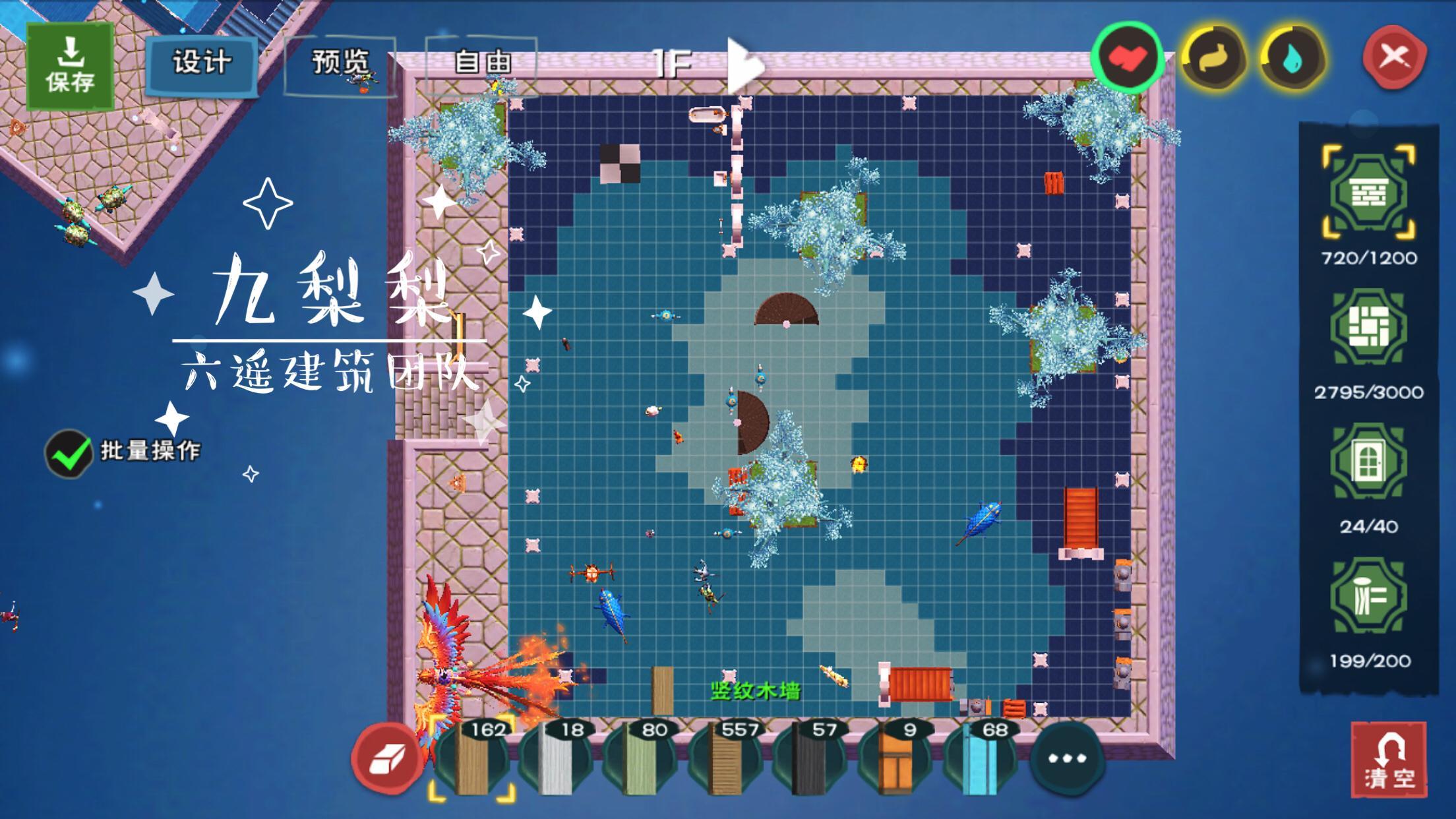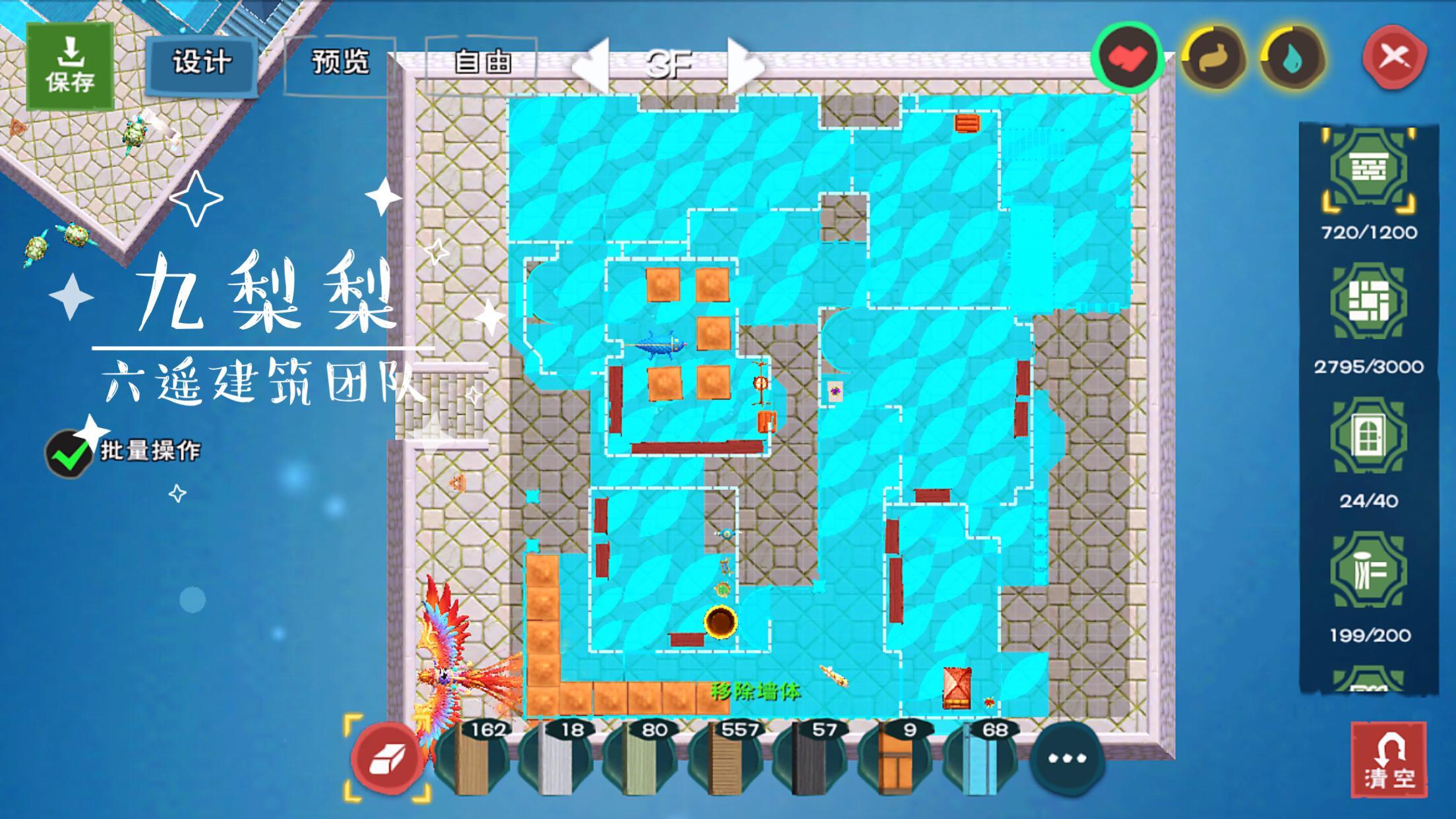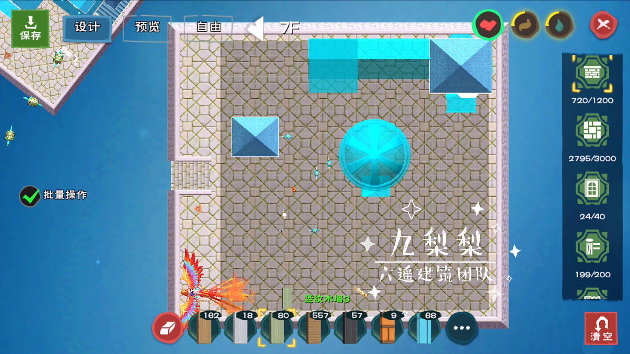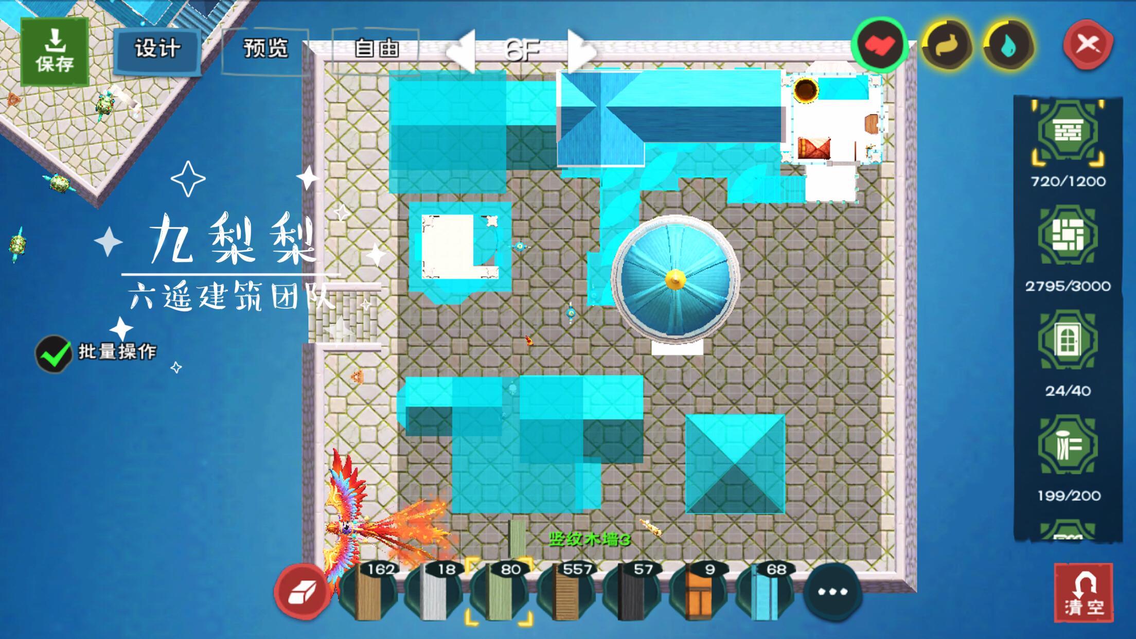 家园面积还是38x38,层数7层,修改的时候正值官方更新欧式建材和家具,所以用了一部分来搭配蓝色玻璃墙,原来一楼的地板没有修改,继续使用,二楼以上的地板改成了纯白色以提升整体亮度。
