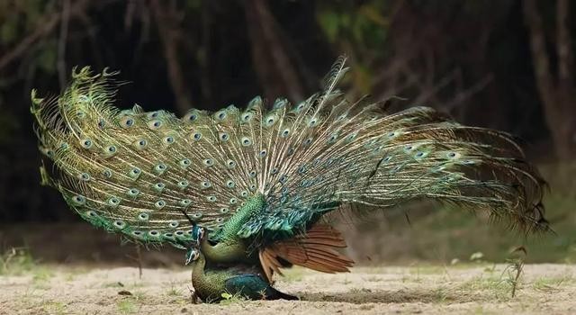 绿孔雀相较于常见的蓝孔雀,其外貌更为华丽。它的颈部羽毛如同“绿宝石”,看起来极似传说中的“龙鳞”。特别是雄鸟,它们的尾羽相当显眼,长达一米多。同样令人瞩目的还有雌鸟的羽毛,它们的色彩绚丽而不同凡响,但相对的,与雄鸟的大尾巴相比起来有所不同。相较于普通孔雀,其具有自己独特的特点。在绿色和各种斑斓色彩的衬托下,绿孔雀显得尤为华丽且引人注目。