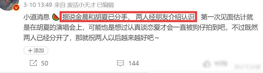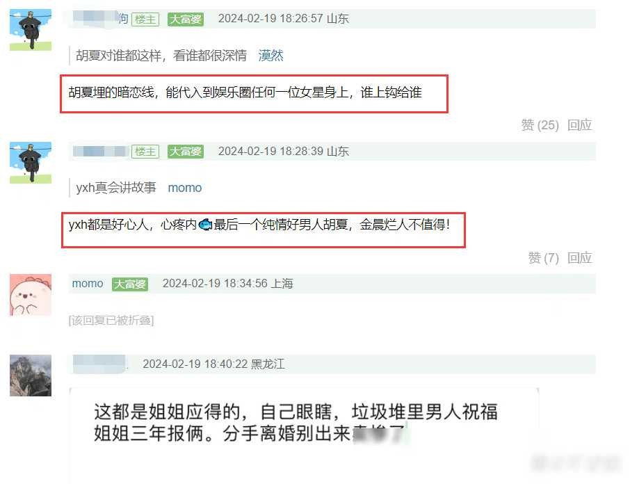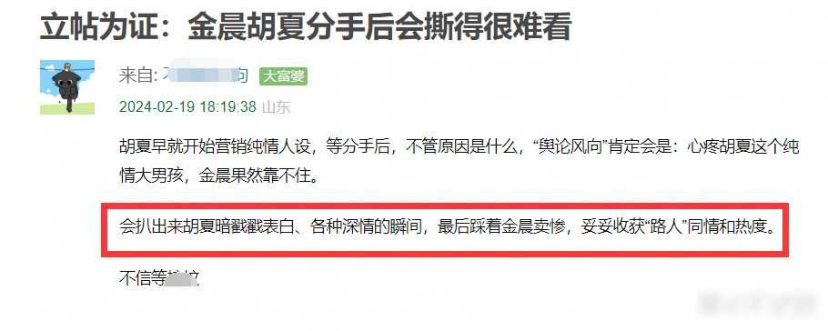 有网友早在2月份就发帖预言金晨胡夏分手后的舆论风向,认为可能演变成一场深刻的“撕逼”戏码,预测舆论将偏向“心疼胡夏”一方。当时,网友对于舆论的揣测甚至牵涉到了对胡夏表白瞬间的预测。
