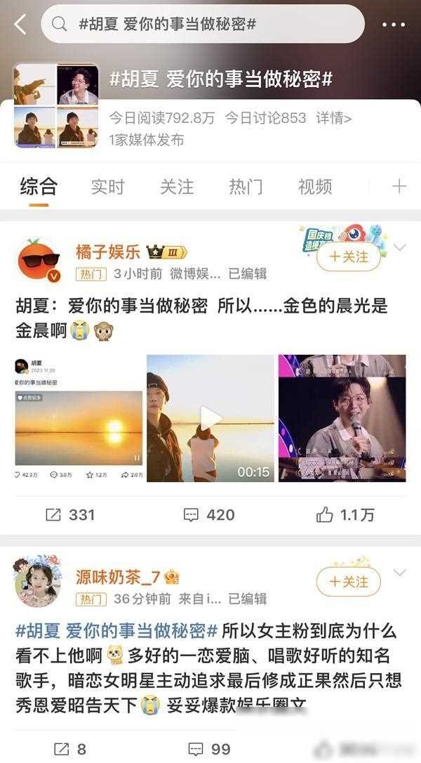 胡夏和金晨的恋情自公开以来,频频登上热搜榜。特别是胡夏的“暗恋文学”,引发广泛社会讨论,成为网友关注的热点。有网友形容这段感情为“爆款娱乐圈文”。