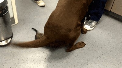拉布拉多对人是很热情的,很容易开心的它们,是很喜欢摇自己的尾巴。但养过拉布拉多的铲屎官都知道,千万别站在它身后,因为拉布拉多尾巴抽人真的疼。