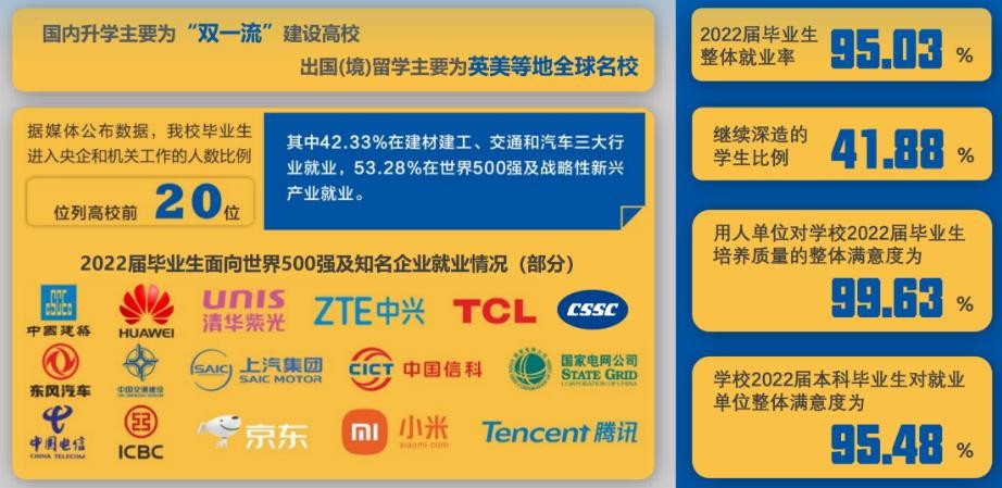 就业情况:学校毕业生就业率近十年持续保持在95%以上,其中到世界500强企业和战略性新兴产业领域就业人数占总就业人数比例超过50%。在2021年举行的全国就业创业工作会上,学校作为唯一高校代表作典型发言。2023年7月,中央电视台《焦点访谈》栏目专题报道该校就业工作。