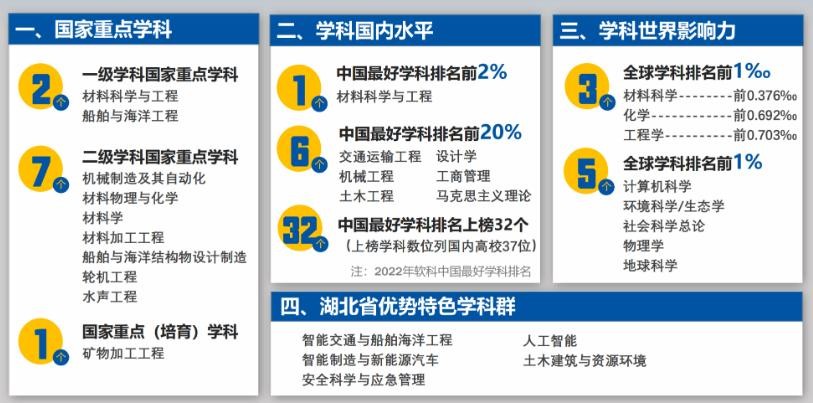 特色优势:科研优势:学校建有材料复合新技术国家重点实验室、光纤传感技术与网络国家工程研究中心、硅酸盐建筑材料国家重点实验室、国家水运安全工程技术研究中心、水路交通控制全国重点实验室等50个国家级和省部级科研基地。学校获批交通强国建设试点单位,入选首批国家知识产权示范高校、第二批高等学校科技成果转化和技术转移基地。地理优势:位于九省通衢的武汉市,英雄的城市。理工优势:不再赘述。