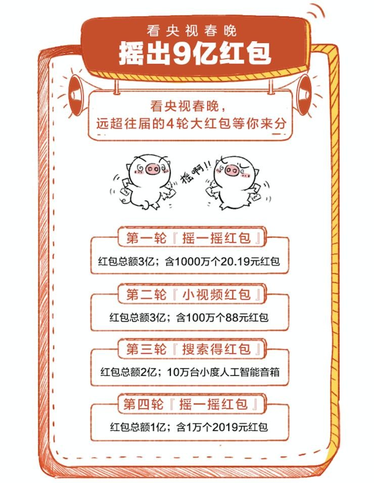 2019年《春节联欢晚会》将于2月4日20:00拉开序幕,除夕夜春晚会放出9亿巨额红包,而且玩法上会有新花样,不仅可以动手摇红包,还可以用“语音搜索”功能动口抢红包,更有10万台小度人工智能音箱等着抢!